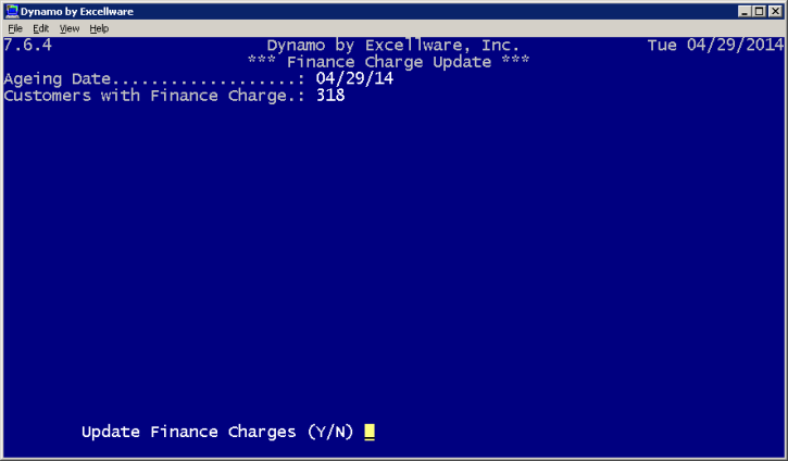 After correcting any errors, the operator can then use this application to update the finance charges by indicating the date. The information will be posted to the specified General Ledger account. Choose Y to update and choose N to cancel the update.