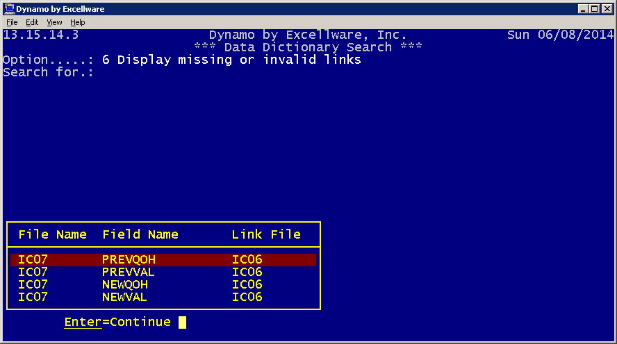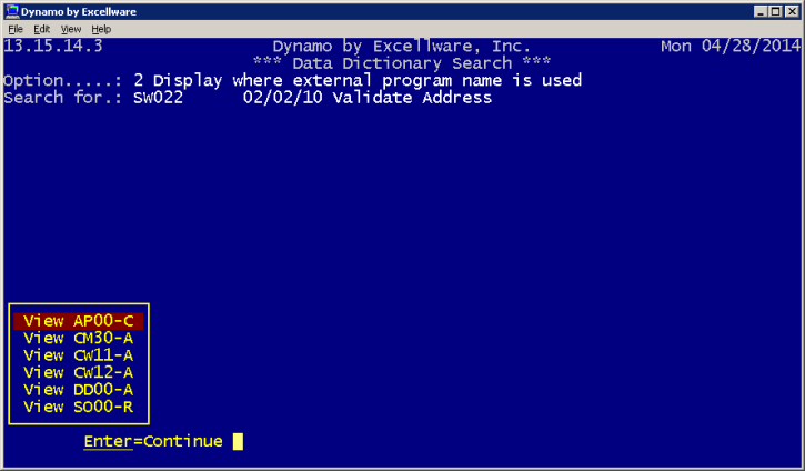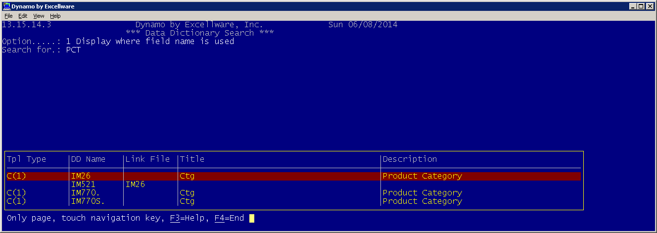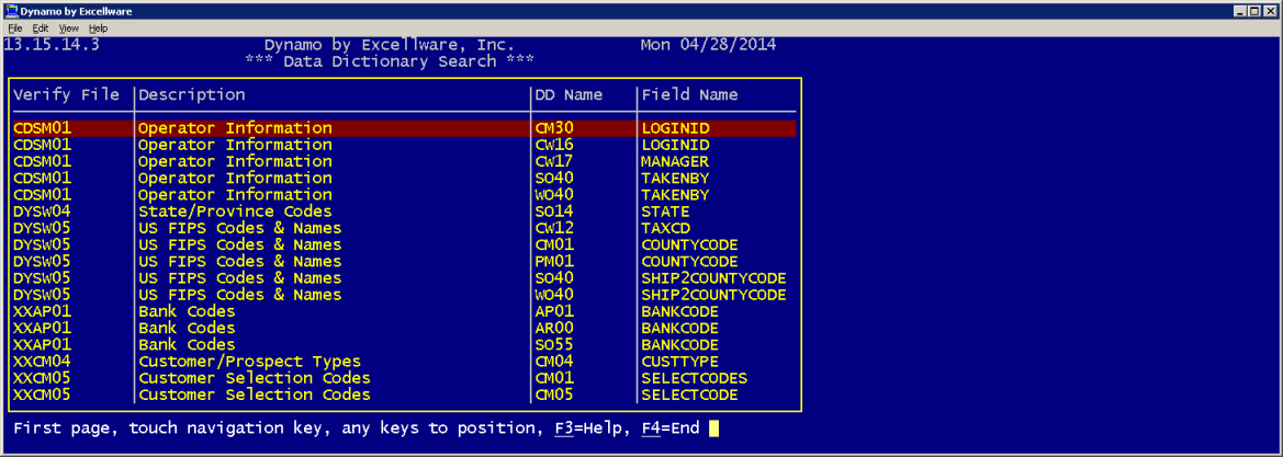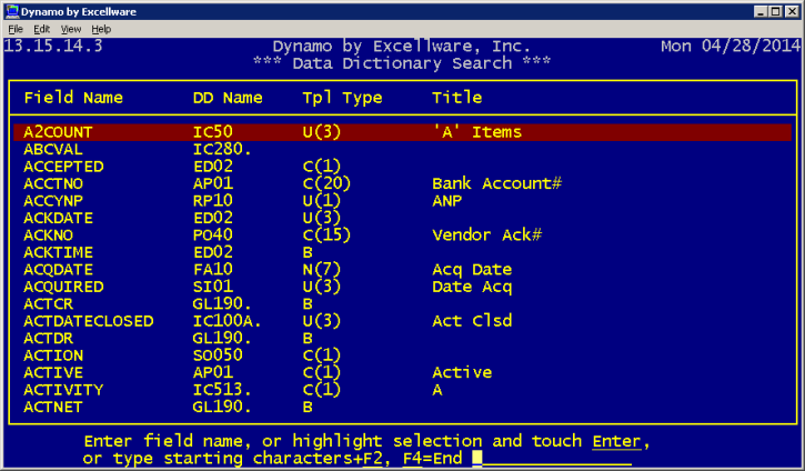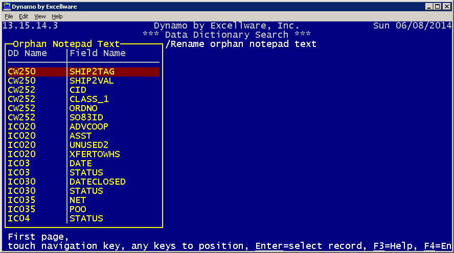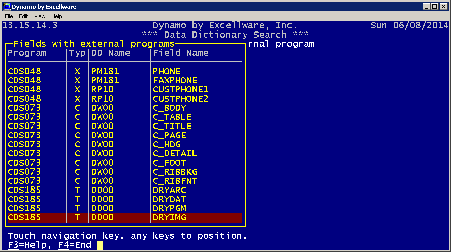 This option can be used when you need to find all places that a particular field name is used. You can enter a field name, starting characters of a field name, or just touch F2 to select from a list of all field names in alphabetical order, as shown in the screen shot below.