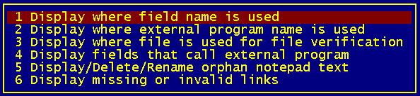 When a field is deleted using Data Dictionary Maintenance, it can be pasted into a different location within the data structure. As a result, the notepad text associated with that field name is not automatically deleted. When a field is renamed, any existing notepad text probably should be renamed as well. This process can result in notepad text that refers to a field name that has been deleted. This option can be used to list any orphan notepad text, to display the text, and to delete individual notepad text entries. It also provides an option to delete all orphan notepad text.