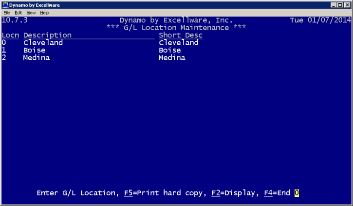 The General Ledger Location Maintenance program is only applicable for those companies who have multiple sites. It is used for setting up, adding, changing, or deleting location codes and description.
