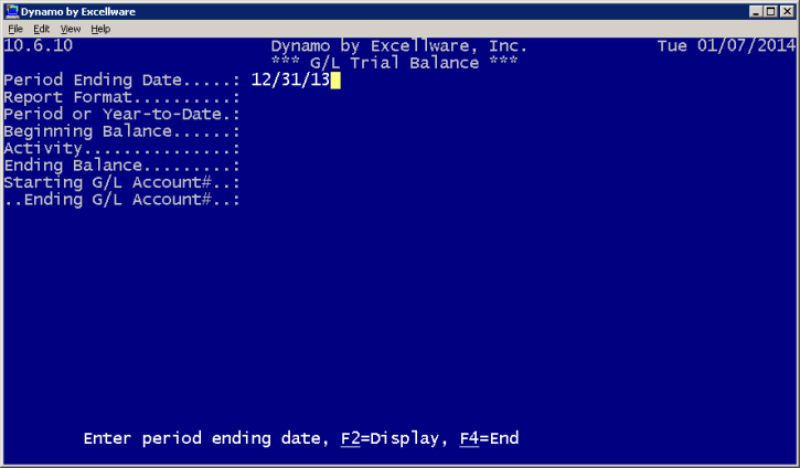 The G/L Trial Balance is a listing of all account balances. It provides a means for testing whether total debits equal total credits. General ledger account information can be printed in the following formats for an operator-specified period: