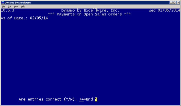 This program creates a listing of payments up until a specified date on open sales orders. That date can be today or any date leading up until then. The listing shows the cash drawer name, the payment date, the general ledger date, the batch number, the sales order number, the customer, the salesman, the order date, the invoice date, the general ledger date, the payment type, and the payment amount of each open sales order.