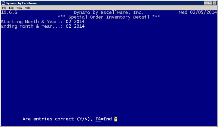 Special Order Inventory Detail is used to display transactions in the operator-specified time period for any items that are not on file. It can be used to identify those purchased items (which are not assigned an item number in item maintenance) to make sure they were sold. The report will contain the date, the reference number, the warehouse, the item number and description, the quantity of the transaction, the cost of the transaction, and the balance.
