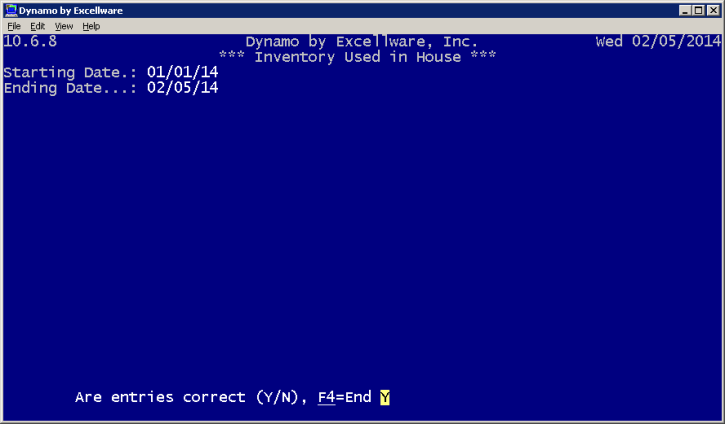 This program allows the operator to view a listing of inventory used within his/her own company. The listing displays the warehouse, the general ledger date, whether or not it is on file, the cost, the unit, the General Ledger amount, the reference number, the login ID of the person who made the transaction, the batch number, the General Ledger debit, and the General Ledger credit. This report can be used to help prepare the use tax return, which needs to be paid on any items used in house (as they have not been sold).