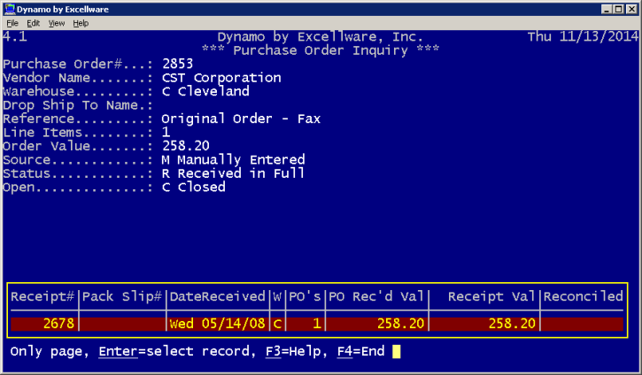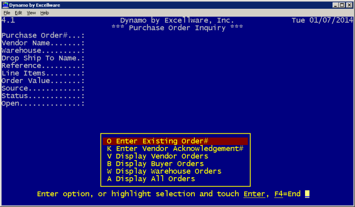 | (V) Display Vendor Orders | Choose a purchase order from a vendor list. |
