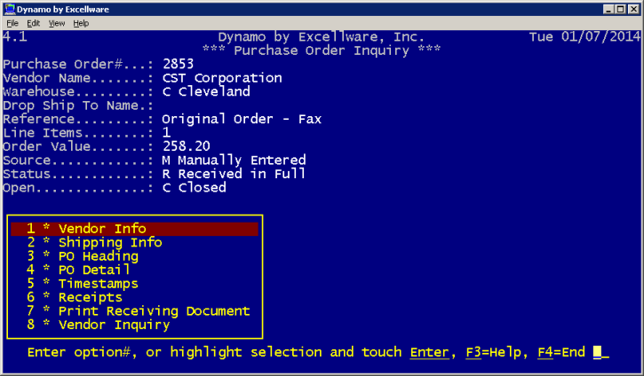 | 8. Vendor Inquiry | Launches the Vendor Inquiry application to search for a vendor. |