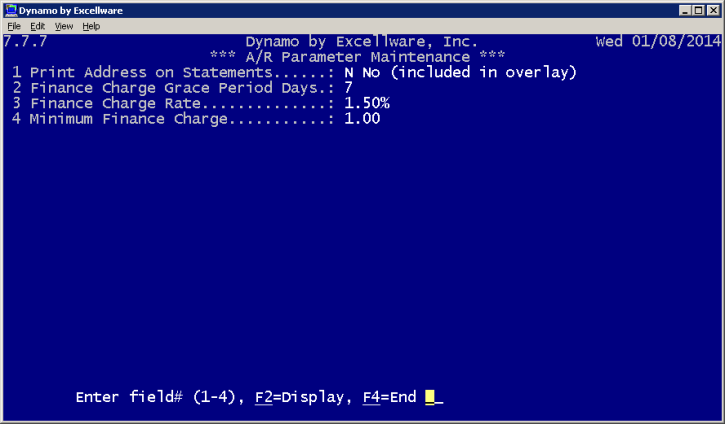 A/R Parameter Maintenance is used to specify whether or not addresses will print on statements as well as define finance charges. The finance charge grace period, charge rate, and minimum charge can all be specified within this application. Enter a number to edit the corresponding field.