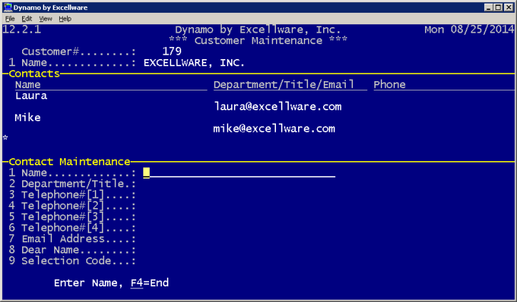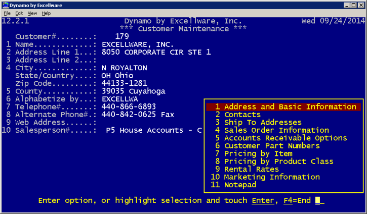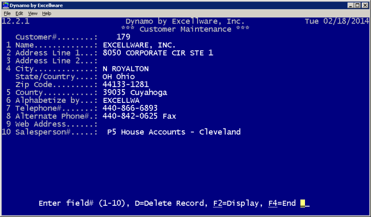To create a new customer, type a unique customer number or let Dynamo use the next existing number. To maintain an existing customer, you can either type their customer number or search for them by typing a customer name, a contact within a company, or the customer's zip code. |