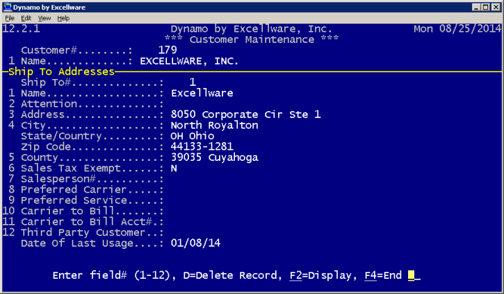 | Date of Last Usage | Dynamo populates this field based on the last time this ship-to address was used on a Sales Order. |