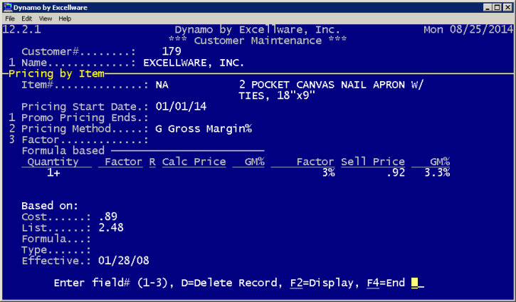 | Factor | Enter the desired gross margin percent, multiplier times cost, discount percent, or multiplier times list price. |
