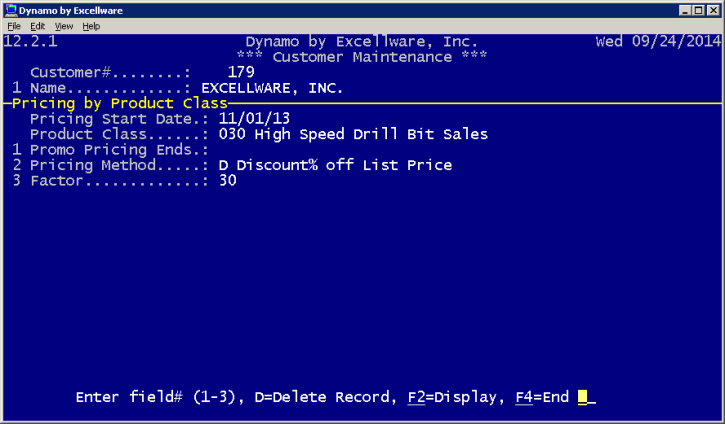 Dynamo allows specific pricing for product classes. If this option is used, then it is maintained here. Pricing by product class, as opposed to pricing by item, saves time since the operator does not have to enter prices for each specific item. Product Classes are maintained on the IML menu.